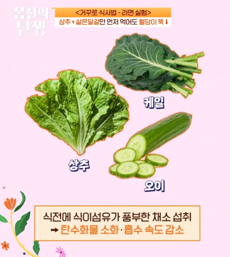식사 전 "상추 5장 + 삶은 달걀 1알"을 먼저 먹는 것이 추천되었습니다. 꼭 상추가 아니더라도 식이섬유가 풍부한 채소라면 효과는 충분합니다.