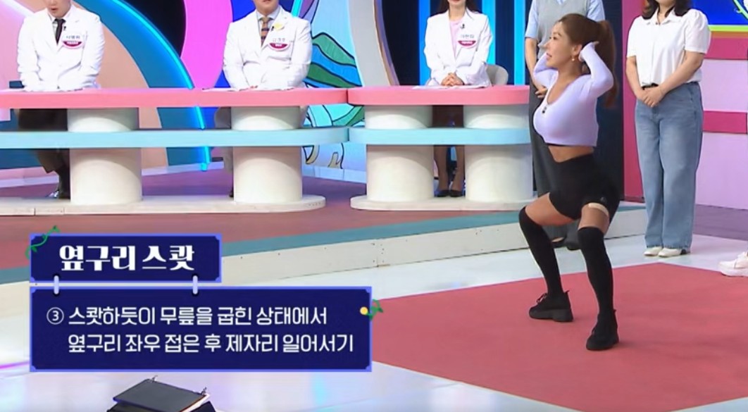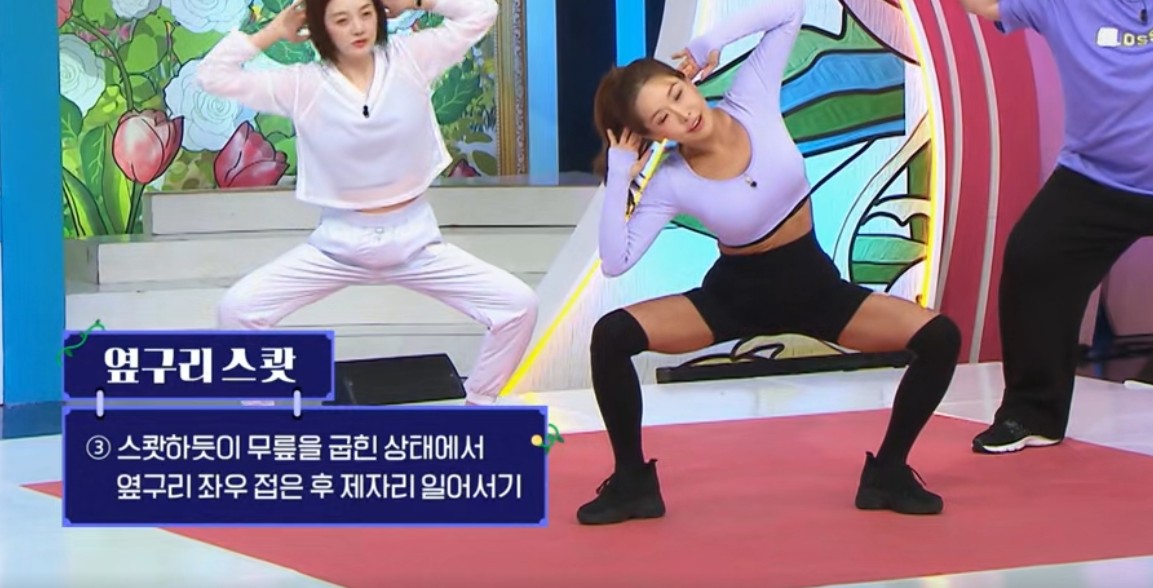 • 스쾃 자세로 무릎을 굽힌 상태에서 옆구리 좌우 접기 → 제자리 일어서기 반복.