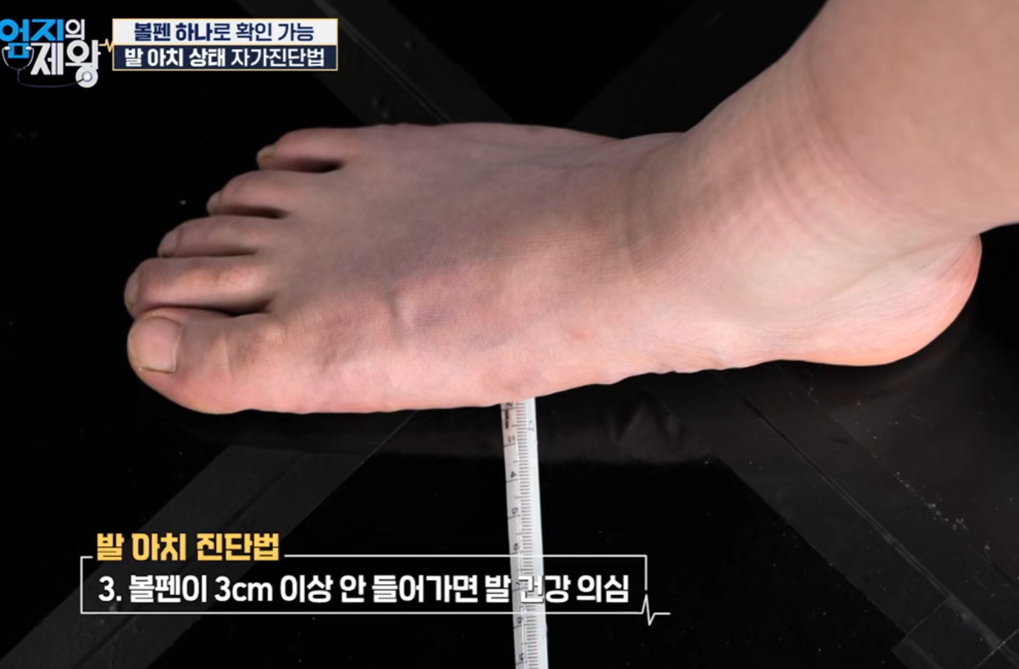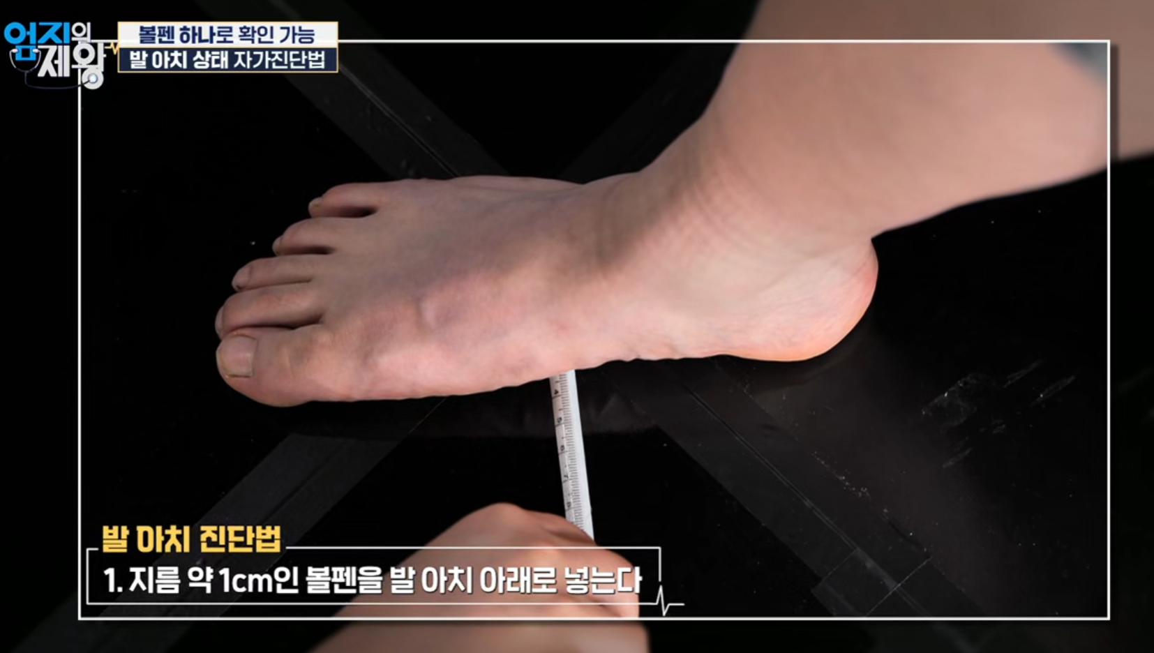 같은 회차에서 소개된 발 아치 상태 자가진단법은 매우 간단합니다.