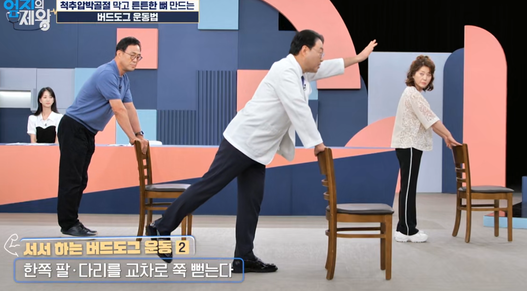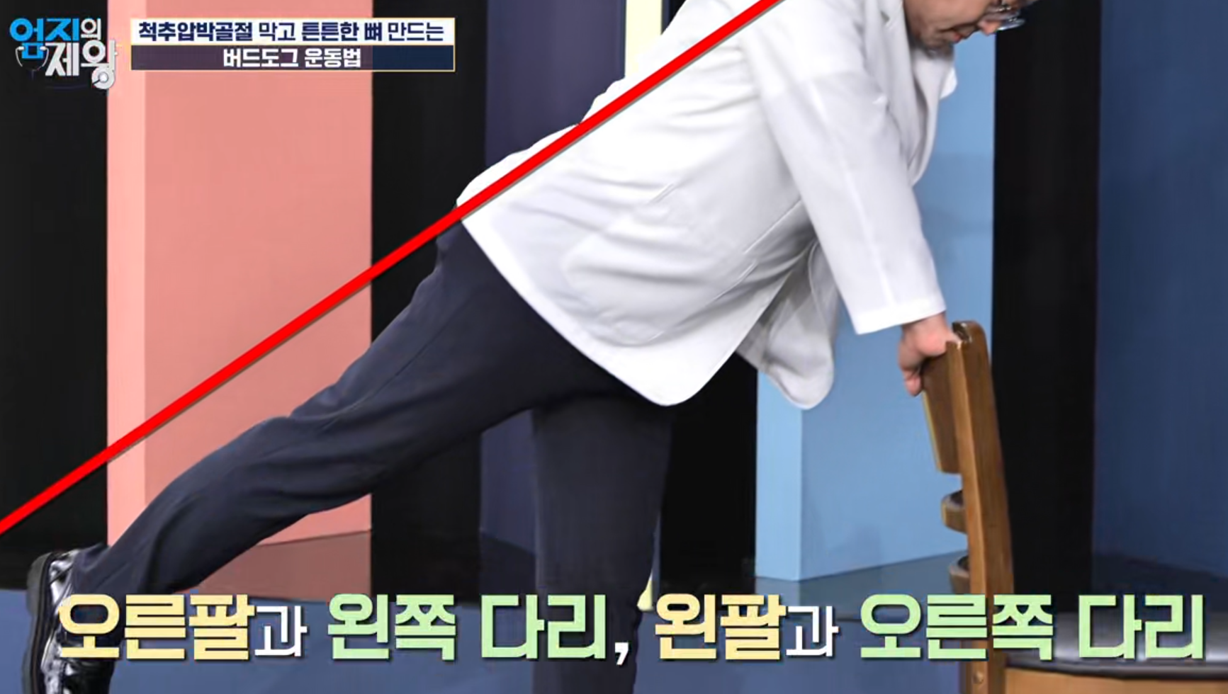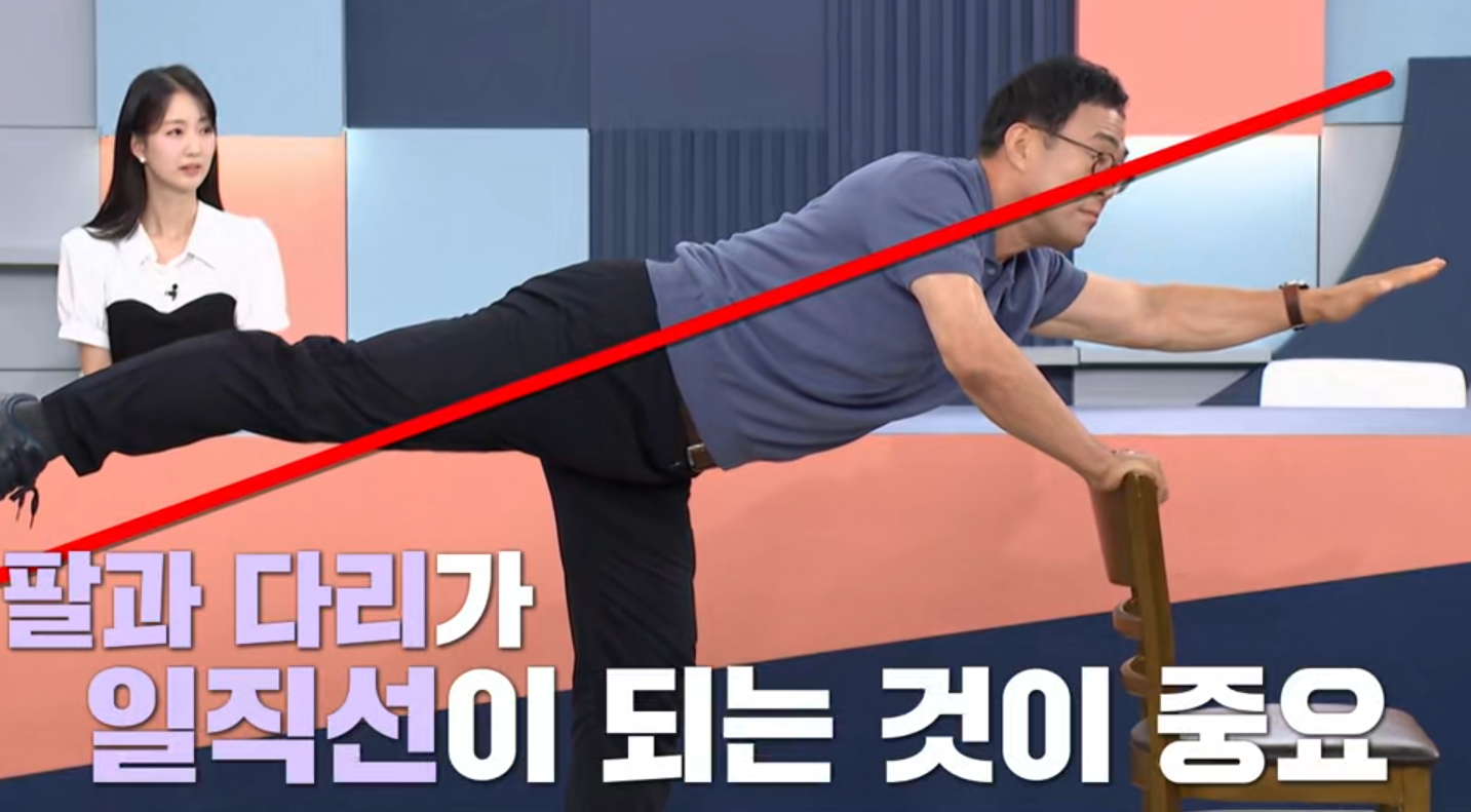 바닥형 버드도그는 손목·무릎 등 관절에 부담이 될 수 있어 노년층이나 관절염이 있는 분들은 어렵게 느낄 수 있습니다. 고도일 전문의가 소개한 방식은 의자 또는 테이블을 잡고 서서 수행하는 변형으로, 낙상 위험을 낮추고 골다공증 환자도 시도하기 좋은 방법입니다.