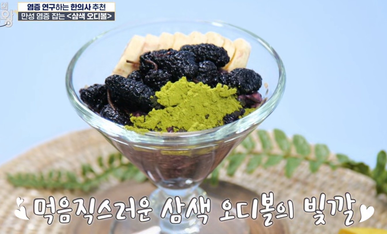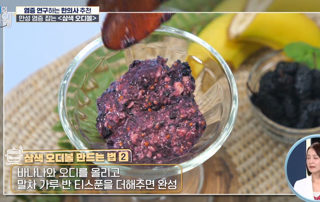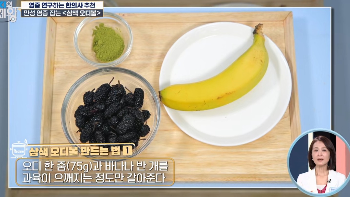 이 레시피는 MBC 건강 프로그램 <엄지의 제왕> 660화에 출연한 정세연 한의학 박사가 직접 소개한 식치(食治) 음식입니다. 만성 염증 완화에 도움을 줄 수 있는 오디·바나나·말차의 조합이 핵심이에요.