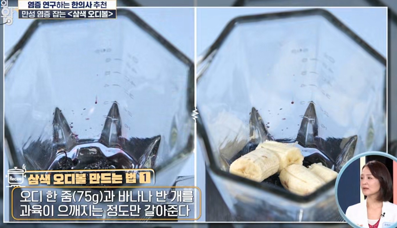 이 레시피는 MBC 건강 프로그램 <엄지의 제왕> 660화에 출연한 정세연 한의학 박사직접 소개한 식치(食治) 음식입니다. 만성 염증 완화에 도움을 줄 수 있는 오디·바나나·말차의 조합이 핵심이에요.