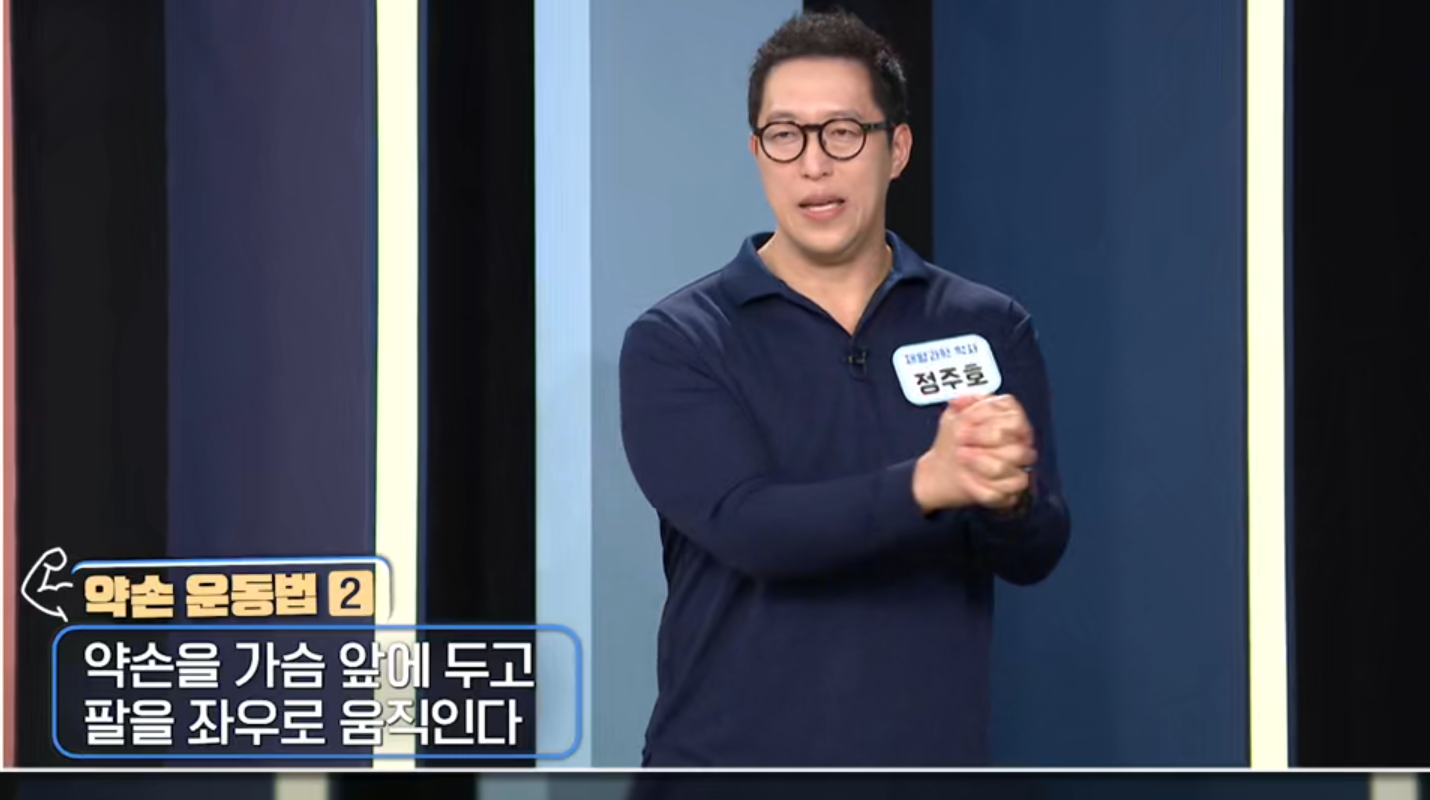 2. 좌우 회전: 약손을 가슴 앞에 두고 상체는 고정한 채 팔을 좌우로 빠르게 돌립니다.
