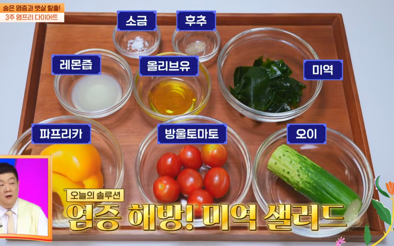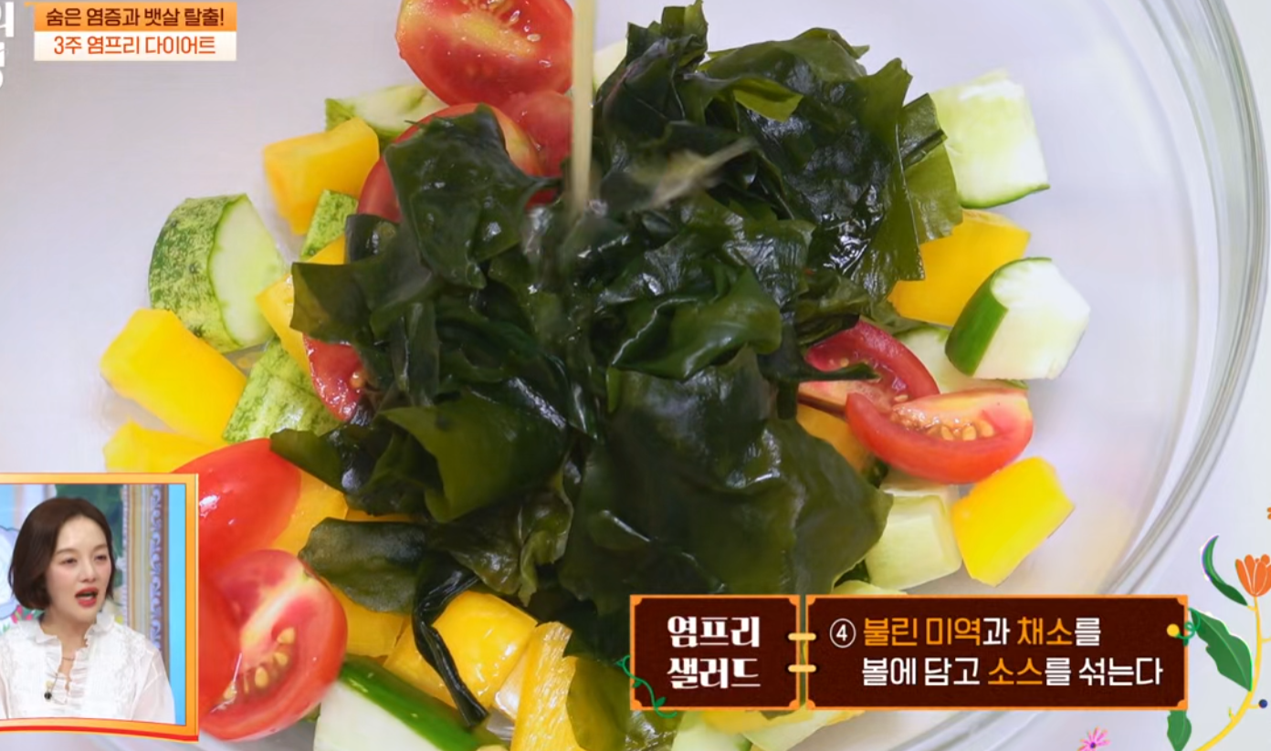 아침·저녁 염프리 미역샐러드에 삶은 달걀·두부·닭가슴살 등 단백질을 곁들이고, 하루 걷기를 루틴화하면 염증·내장지방 동시 타격에 효과적입니다.