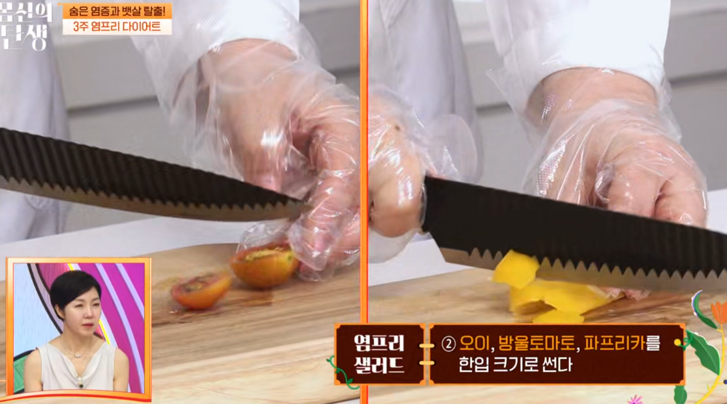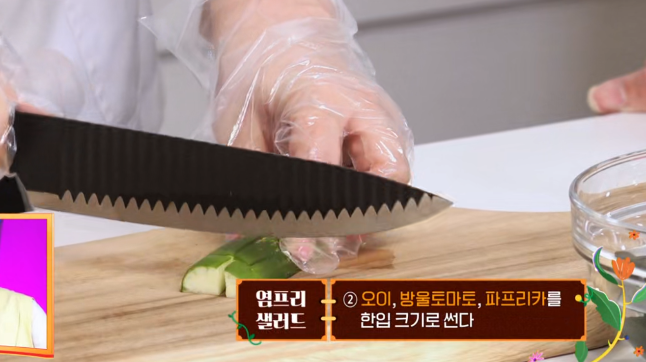 - 오이·방울토마토·파프리카를 한 입 크기로 썬다.