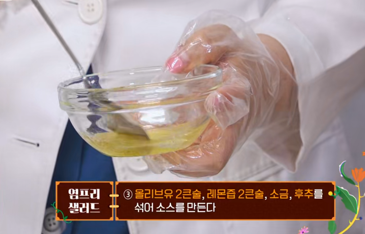 - 올리브유 2큰술, 레몬즙 2큰술, 소금·후추를 섞어 드레싱을 만든다.