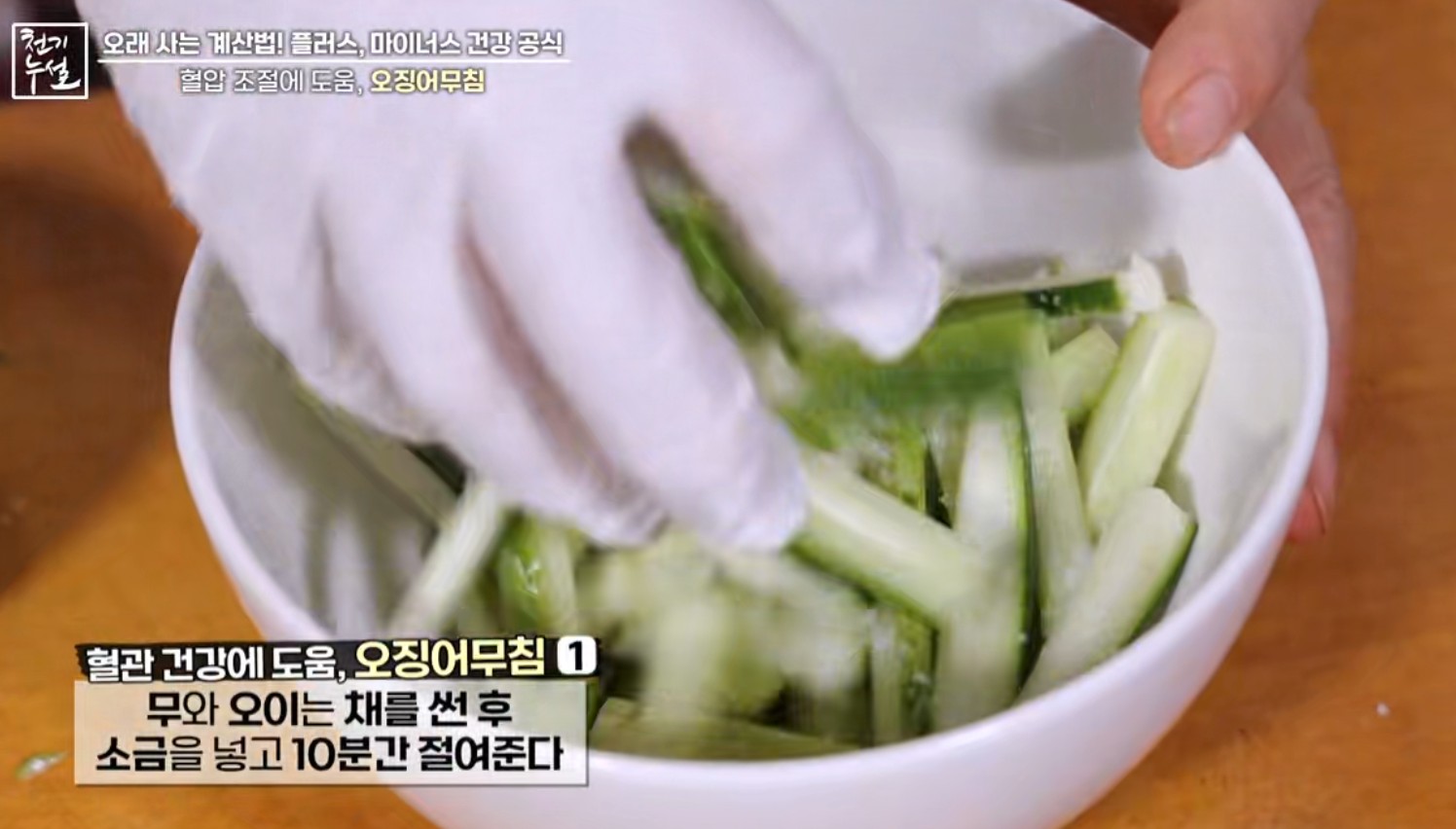 - 무·오이를 채 썰어 소금으로 약 10분 절입니다.