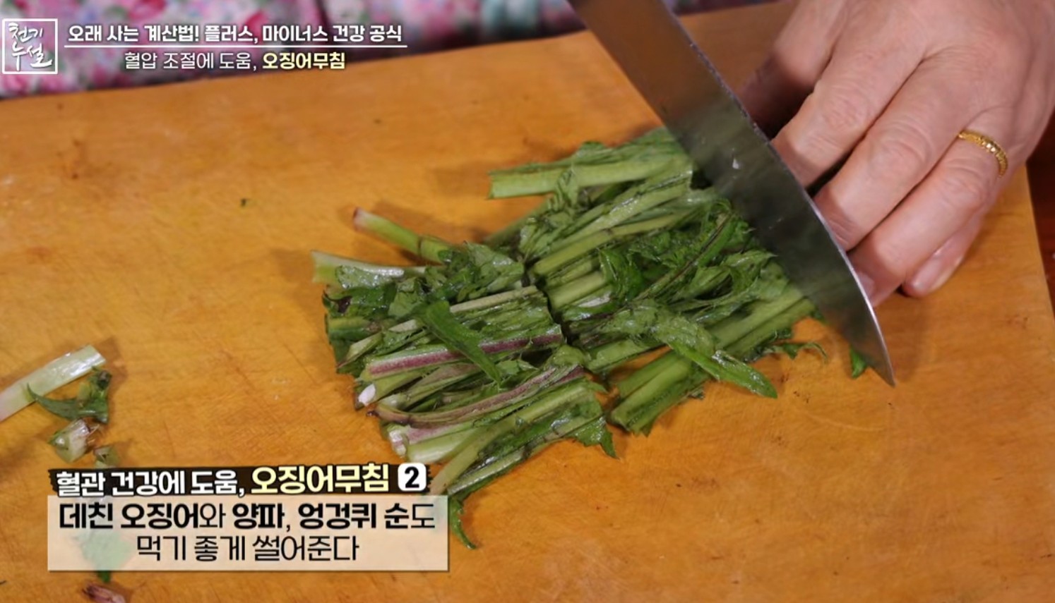 2. 데친 오징어·양파·엉겅퀴 순을 먹기 좋게 썹니다.