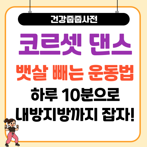 코르셋 댄스 운동법은 단순히 뱃살 빼기에 좋은 것뿐만 아니라, 복횡근 강화, 변비 개선, 내장지방 감소까지 종합적인 효과를 줍니다. 턱 주변 침샘이 불룩해지는 작은 신호를 놓치지 말고, 지금부터 하루 10분 코르셋 댄스로 건강한 변화를 시작해 보세요.