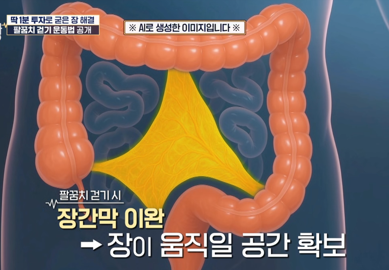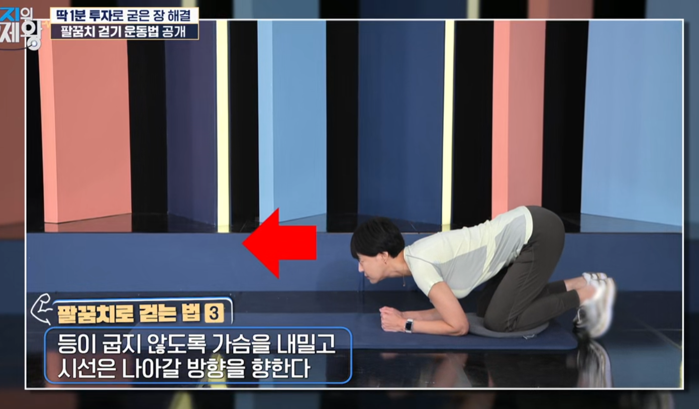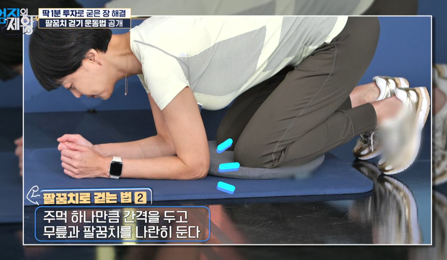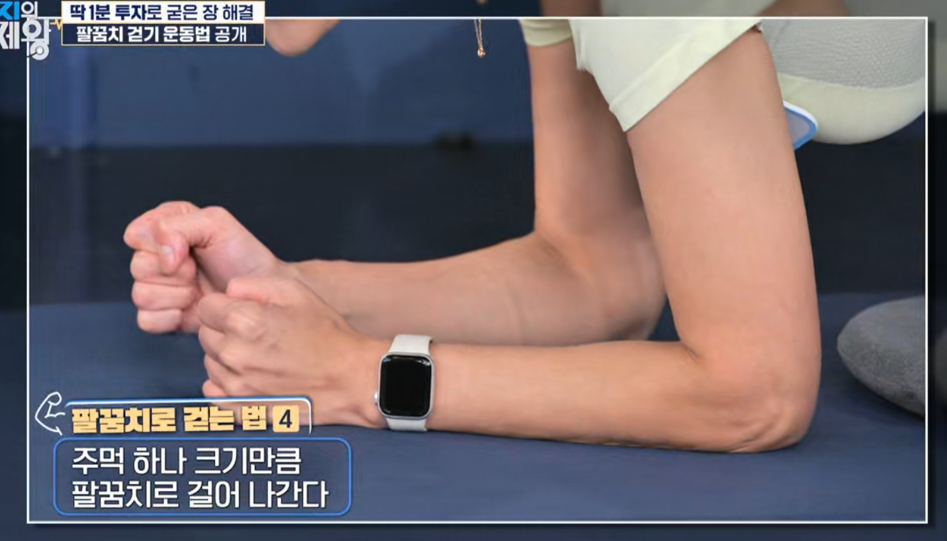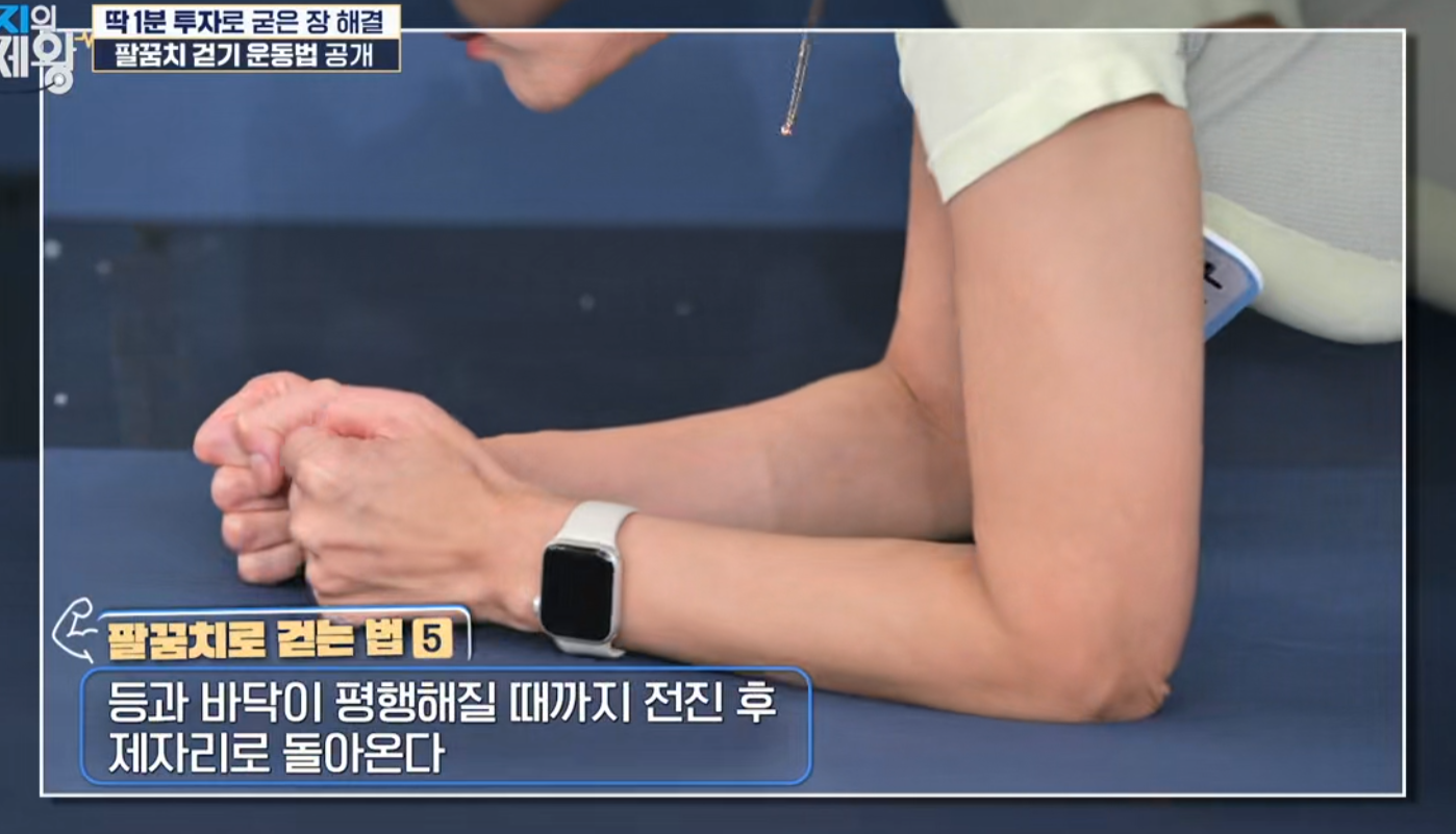 팔꿈치 걷기 운동으로 노폐물과 독소를 배출하고 변비를 해결하세요. 엄지의 제왕 658화에서 공개된 하루 1분 장 건강 운동법!