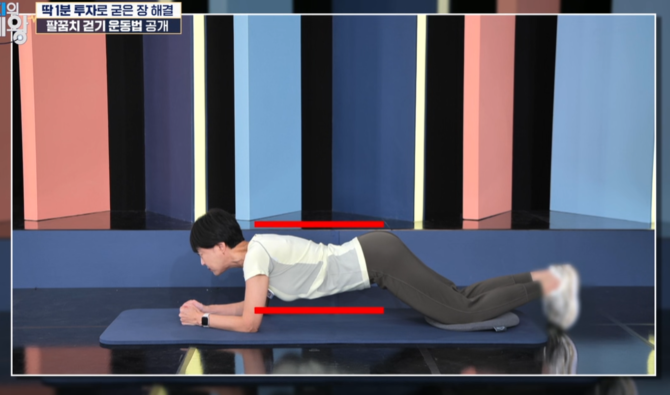 이번 방송에서 운동처방사 김선우 선생님이 추천한 운동법은 바로 “팔꿈치 걷기”입니다. 플랭크 자세를 응용하여 하루 1분 투자로 장 활동성을 높여주고, 장독소 배출을 돕는 초간단 운동법이죠.
