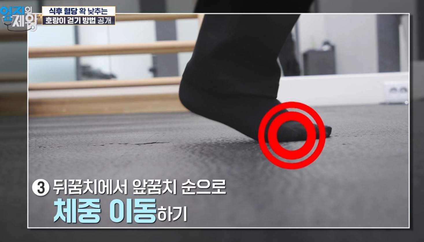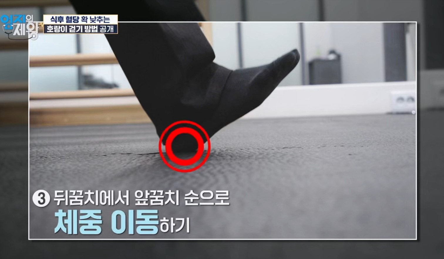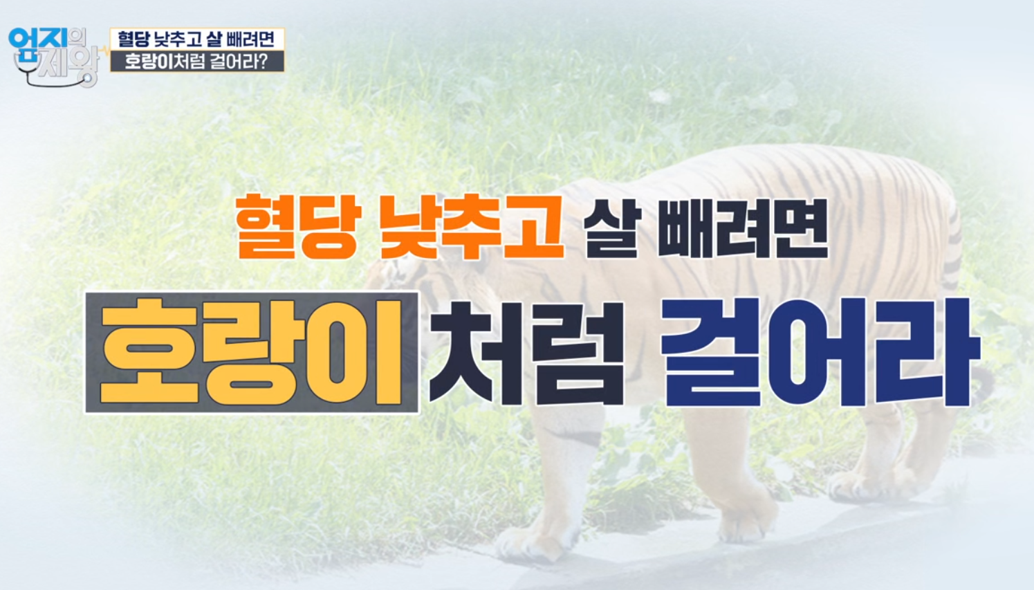 주제: “식후 혈당을 확 낮추는 방법”으로 호랑이 걷기가 소개됨. 핵심은 발을 일자로 맞추는 일자 보행과 근육 활성도를 높여 같은 10분이라도 혈당·체중 관리에 더 유리하도록 만드는 점.