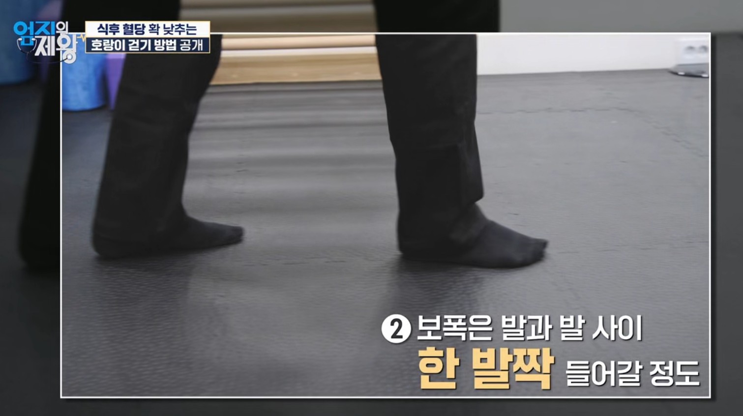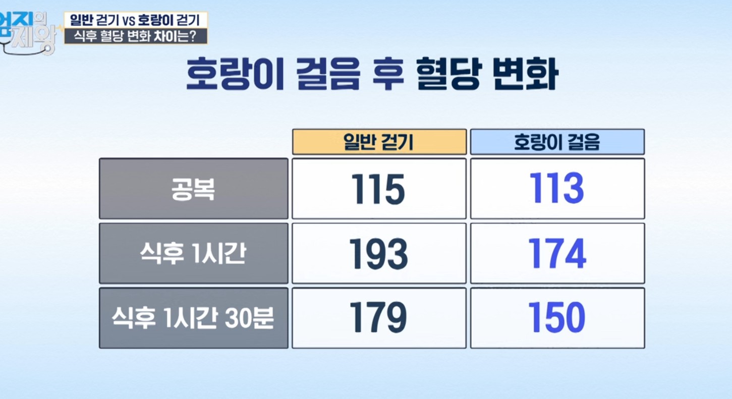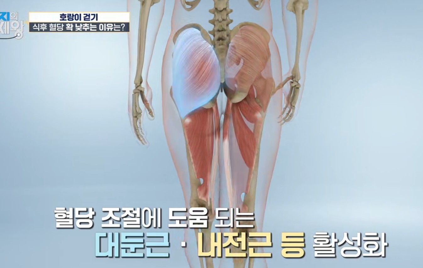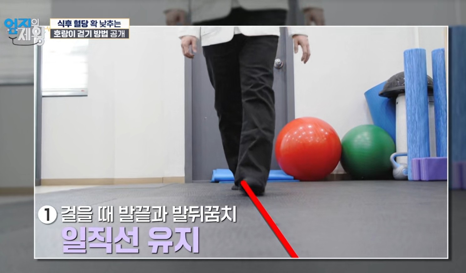 주제: “식후 혈당을 확 낮추는 방법”으로 호랑이 걷기가 소개됨. 핵심은 발을 일자로 맞추는 일자 보행과 근육 활성도를 높여 같은 10분이라도 혈당·체중 관리에 더 유리하도록 만드는 점.